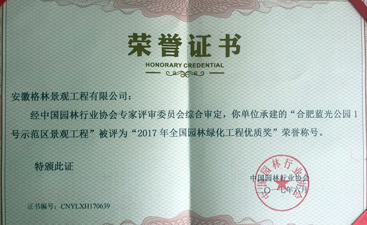 2017年6月18日,由中國(guó)園林行業(yè)協(xié)會(huì)主辦的2017中國(guó)園林綠化發(fā)展高層論壇在大連隆重開幕。會(huì)上,我司承接的“藍(lán)光公園1號(hào)示范區(qū)景觀工程”被授予“2017年全國(guó)園林綠化工程優(yōu)質(zhì)獎(jiǎng)”。