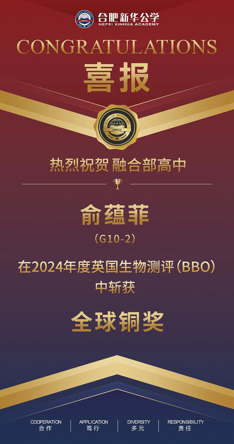 恭喜我校融合高中部G10-2的俞蘊(yùn)菲同學(xué),在2024年度英國生物測評(BBO)中獲得全球銅獎的好成績。