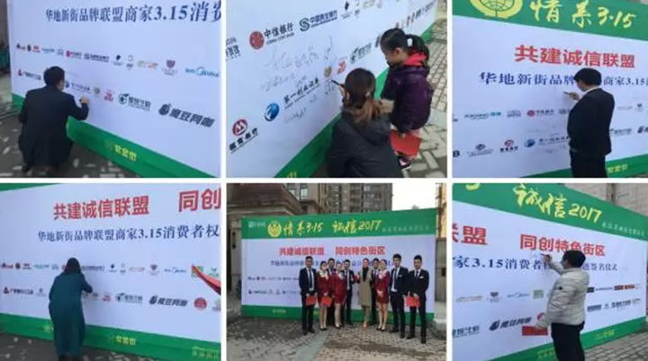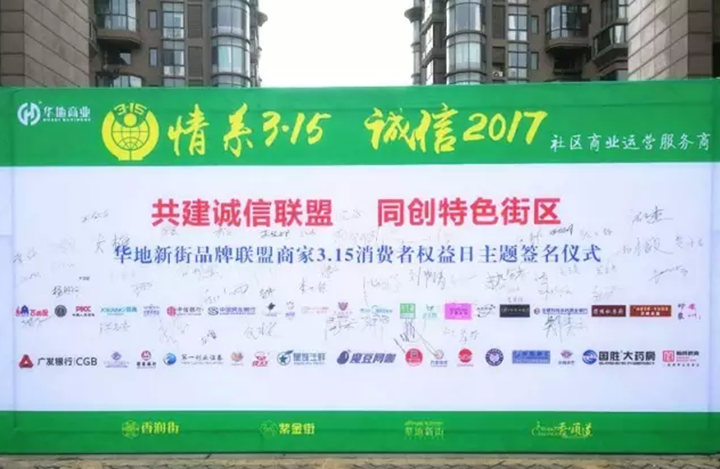 2017年3月15日,“華地新街品牌聯盟商家3·15消費者權益日”主題簽名儀式在華地新街隆重舉行。上午10時,各商戶代表齊聚在品牌墻下,由商業公司工作人員向大家宣讀并發放《倡議書》,各商戶代表在品牌墻上鄭重簽名,為共建誠信聯盟,共創特色街區而簽下鄭重的承諾。