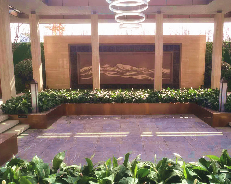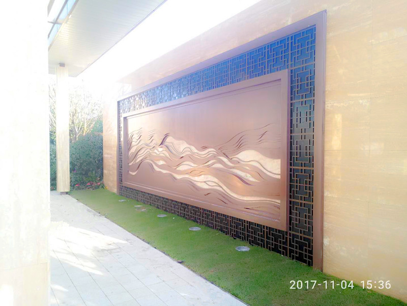廊道北側(cè),一幅鐵藝山水壁畫,恰到好處的豐富了廊道,韻味十足!側(cè)面望去,仿佛置身高山峻嶺之間!