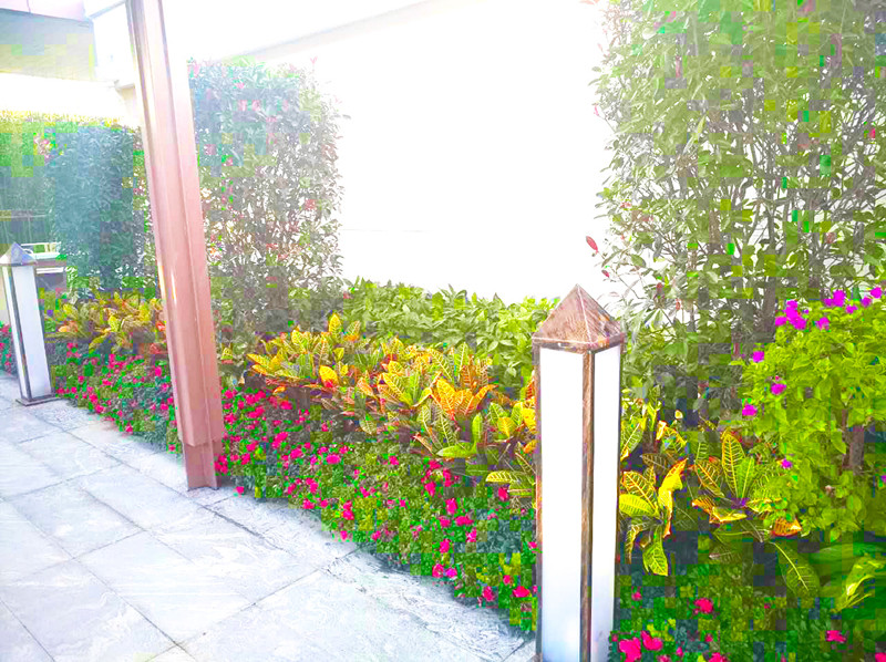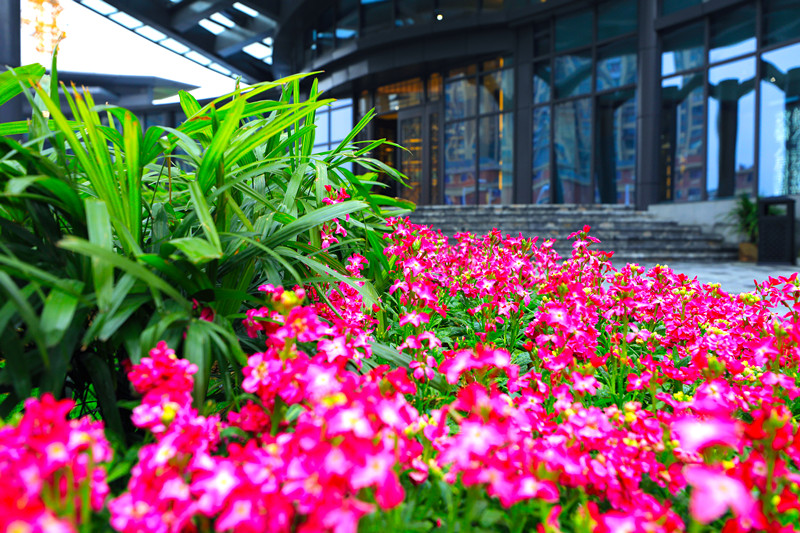 廊道旁,綠油油的草坪,花開正艷的小苗木,修剪成型的灌木,以及筆直的喬木,構(gòu)成了一處處花境!