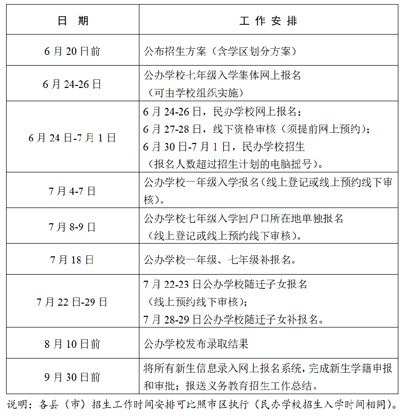 1. 招生時間。公辦學(xué)校招生時間從6月下旬開始,市區(qū)時間安排見下圖,具體時間由各縣(市)、區(qū)教育主管部門安排。