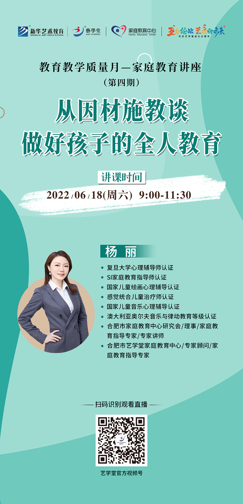 此外,藝學堂教育教學質量月—家庭教育親子類線下講座將于6月18日上午9:00準時開講。我們將邀請家長現(xiàn)場聆聽,僅限50名,歡迎各位家長積極報名~