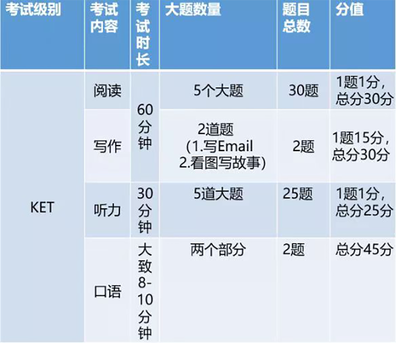 我們再來看看KET考試概況,KET主要考察四大方面,聽、說、讀、寫四大部分,每一部分的題量和分值如下: