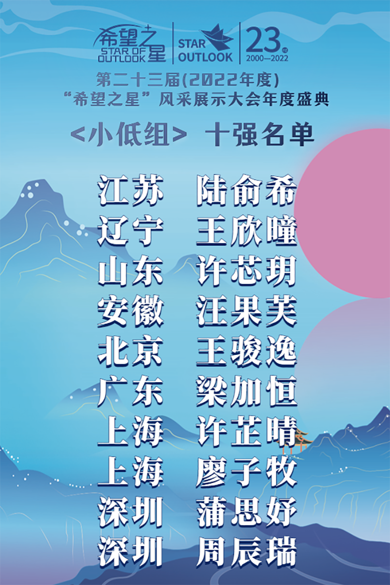 由中央新影中學(xué)生頻道和北京星路風(fēng)采國(guó)際教育咨詢有限公司聯(lián)合主辦的第二十三屆(2022年度)“希望之星”風(fēng)采展示大會(huì)于8月1日-4日,在北京舉辦了全國(guó)年度盛典活動(dòng)。來(lái)自全國(guó)各地的“希望之星”們,經(jīng)過(guò)兩日的同臺(tái)競(jìng)技,都收獲滿滿。五個(gè)組別的十強(qiáng)學(xué)員名單,正式出爐。