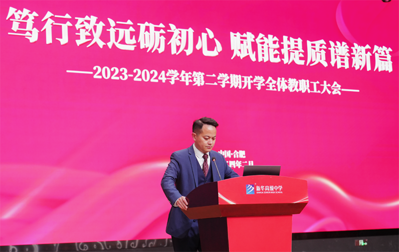 時(shí)序更替,華章日新。為進(jìn)一步凝聚共識(shí),統(tǒng)一思想,全力做好新學(xué)期各項(xiàng)準(zhǔn)備工作,2月19日上午,我校在文體中心報(bào)告廳召開(kāi)新學(xué)期全體教職工大會(huì),會(huì)議由新華高級(jí)中學(xué)黨政辦公室主任夏娟娟主持。全體教職工以龍騰虎躍的精神面貌,充沛飽滿的工作熱情齊聚一堂參加會(huì)議。