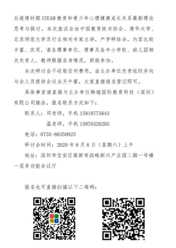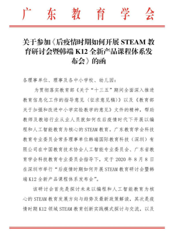 “后疫情時代如何開展STEAM教育研討會暨韓端K12全新課程體系發(fā)布會”將于2020年8月8日舉辦,本次大會的主題是“后疫情時代如何開展STEAM教育研討會暨韓端K12全新課程體系發(fā)布會”,將圍繞在防疫常態(tài)化下人工智能教育、教培機構行業(yè)動態(tài)、機器人大賽趨勢、教育政策解讀等方面進行深入廣泛的交流。