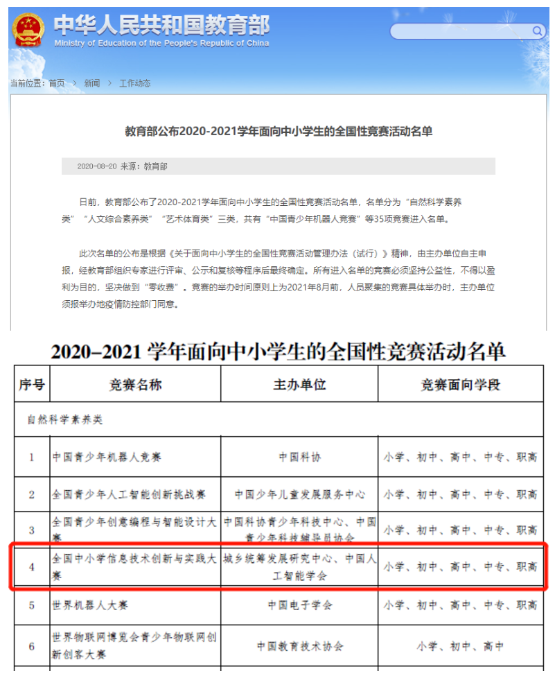 日前,教育部公布了2020-2021學年面向中小學生的全國性競賽活動名單,名單分為“自然科學素養類”、“人文綜合素養類”、“藝術體育類”三類,共有“中國青少年機器人競賽、全國中小學信息技術創新與實踐大賽(NOC)”等35項競賽進入該名單。