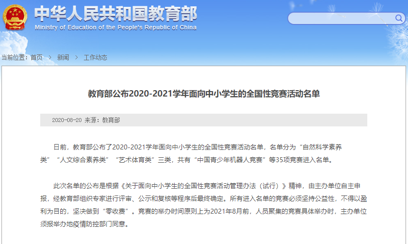 教育部公布的2020-2021學年面向中小學生的全國性競賽活動名單,名單分為“自然科學素養(yǎng)類”“人文綜合素養(yǎng)類”“藝術(shù)體育類”三類,共有“全國中小學信息技術(shù)創(chuàng)新與實踐大賽(NOC)”等多項科技競賽進入白名單。
