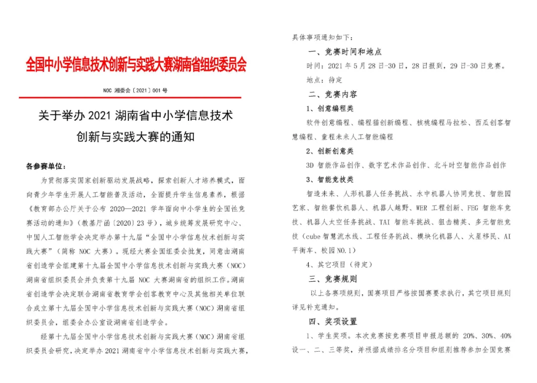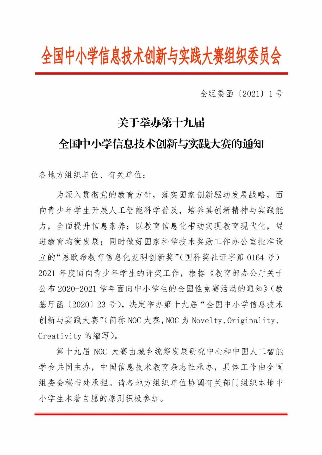 “全國中小學信息技術(shù)創(chuàng)新與實踐大賽”是一項運用信息技術(shù),培養(yǎng)廣大師生的創(chuàng)新精神和實踐能力,面向青少年學生開展人工智能科學普及、引領(lǐng)科技創(chuàng)新的素質(zhì)教育實踐平臺,簡稱NOC大賽(NOC為Novelty, Originality, Creativity的縮寫)。