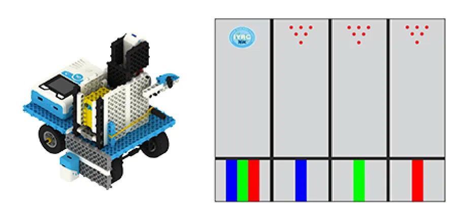 用戶將自己拼搭的機器人放置在START區域,通過刷卡編程控制機器人,進行語音播報、編號顯示、然后發射子彈擊倒任務靶子。編程卡片有動作類型、速度類型、時間類型、條件類型、數顯類型、語音類型卡片等,用戶需要根據任務進行分解,通過邏輯推理,確認好相關編程卡片,完成程序設計,達成任務目標。