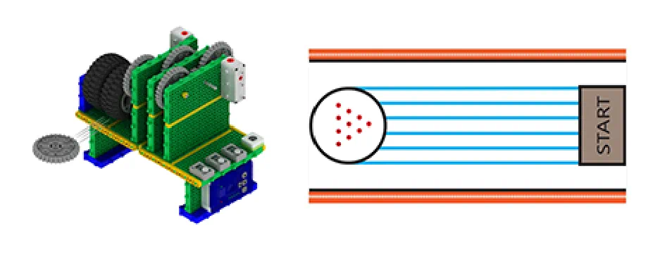 用戶將機器人放置在起始點位置,通過顏色傳感器識別不同顏色彈道并進行擊打,機器人出發后識別移動到指定顏色彈道,停下來擊打道具;然后回起始點位置,切換程序再出發,移動到指定顏色彈道,停下來擊打道具,然后回到起始點位置。切換程序接著在從起始點出發,移動到指定顏色彈道,停下來擊打道具,然后回到起始點位置,任務完成。