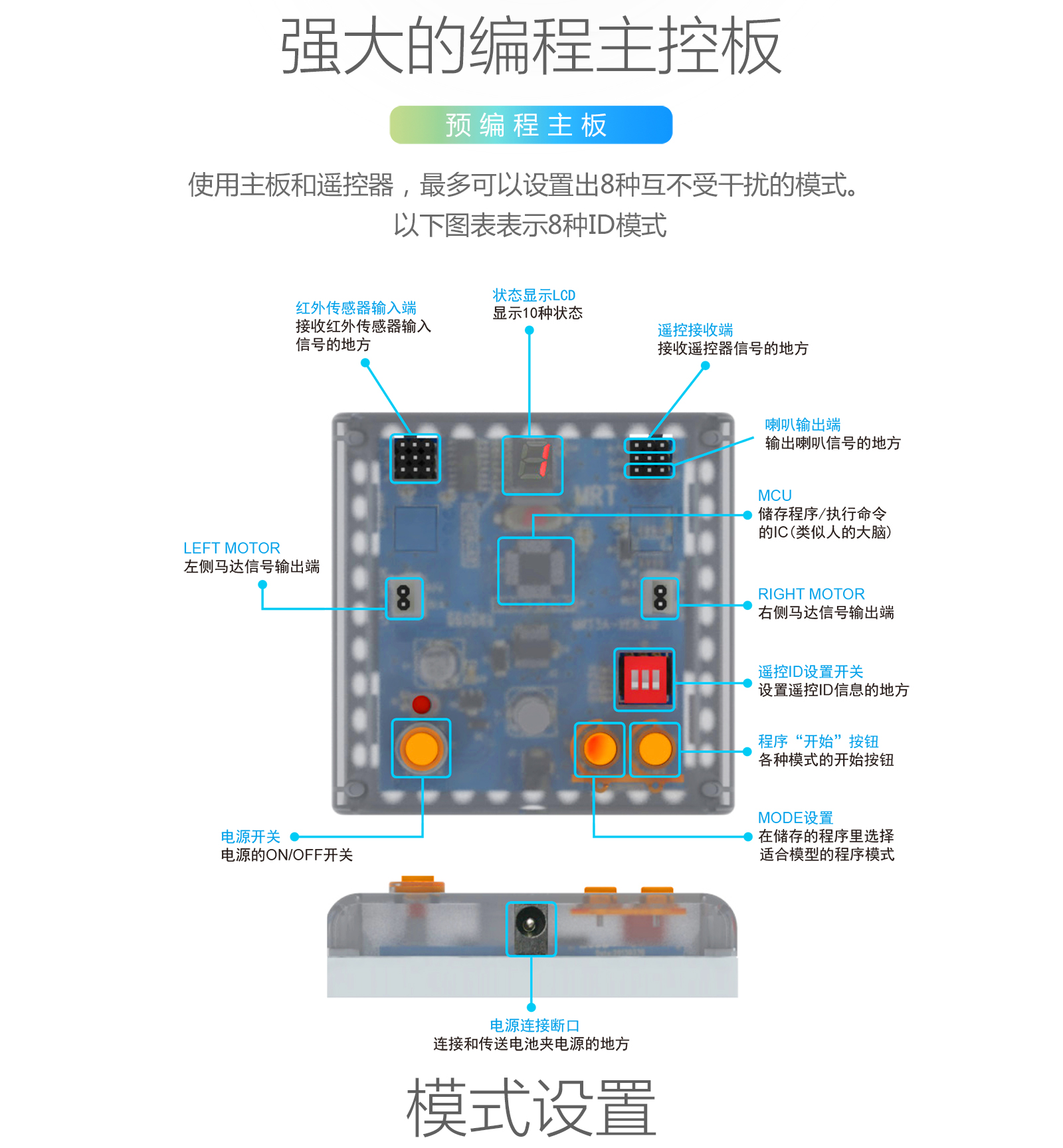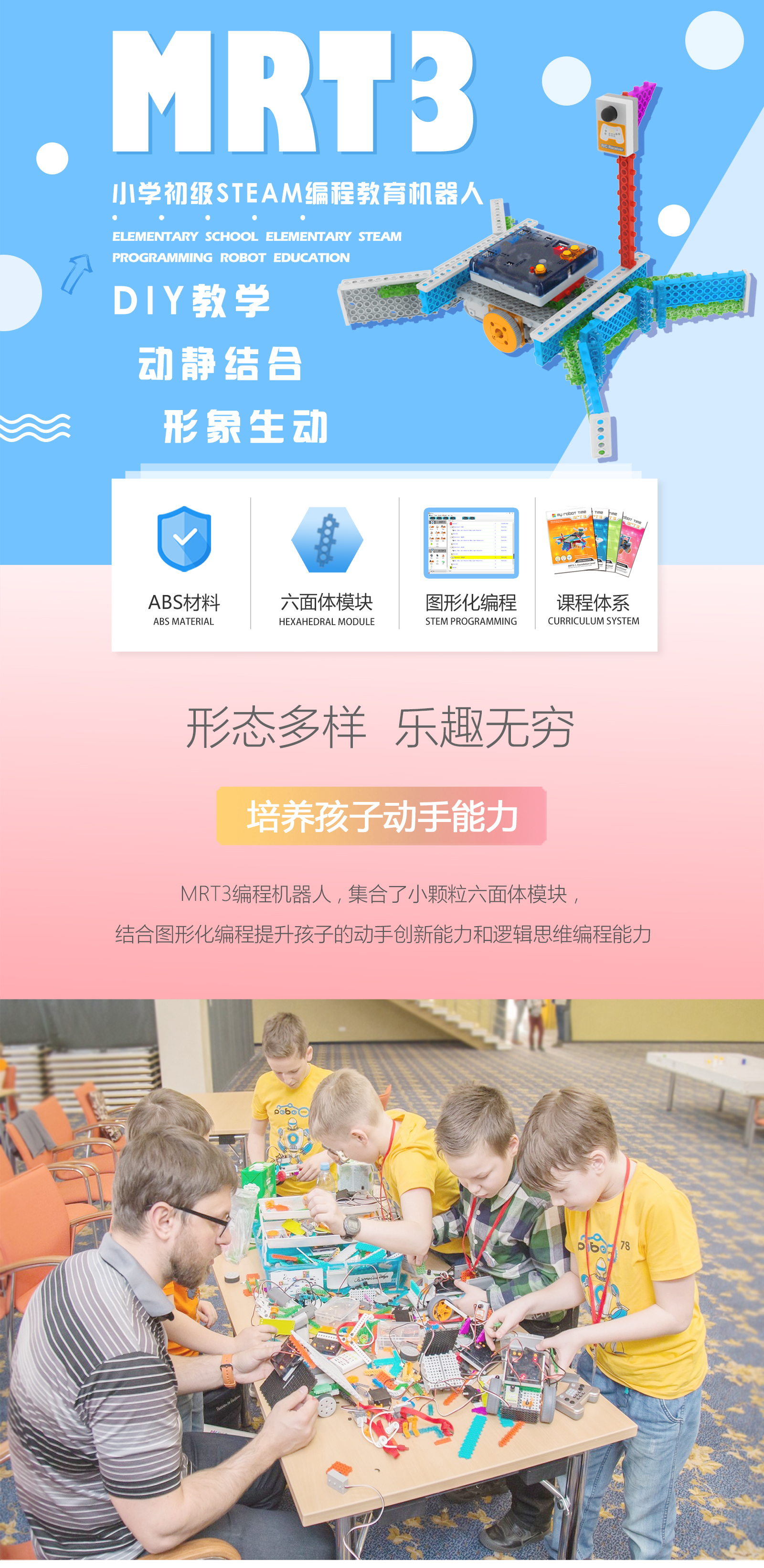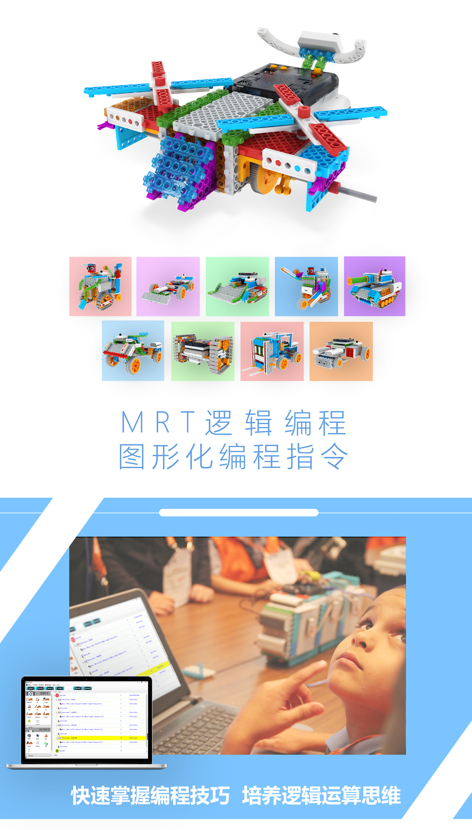 產品參數 產品名稱:MRT3-1 外觀顏色:多彩積木 產品材料:ABS環保材料 模塊特性:六面體模塊,小模塊 電 機:DC馬達*2 主 板:預編程主板,帶LED數碼管顯示,10種模式選擇,2個電機接口,3個輸入 口,3個輸出口 傳 感 器:遙控接收器*1 模型數量:15個(10個動態+5個靜態) 額定電壓:6V (5號電池4節) 功 能:DIY 教學,主板為單片機控制模式,程序已設置完畢,可設置模式,帶遙控器控制。 適用年齡:7-9歲 重 量:1.18KG 配 置:初始教案(英文) 包裝尺寸:寬220*厚280*高90mm 彩盒包裝